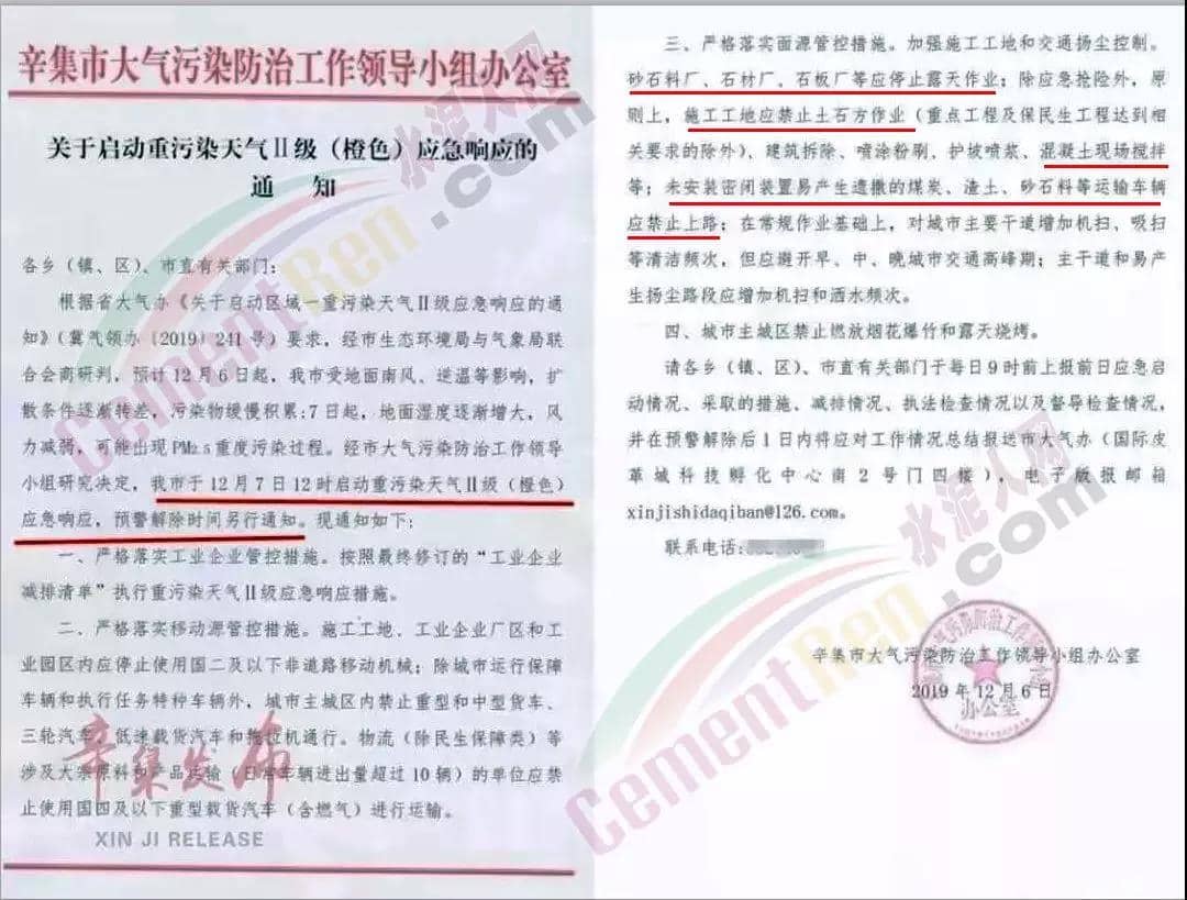 河北省辛集市大氣污染防治工作領(lǐng)導(dǎo)小組辦公室發(fā)布《關(guān)于啟動重污染天氣II應(yīng)急響應(yīng)的通知》稱,自12月7日12日啟動重污染天氣II級應(yīng)急響應(yīng),在應(yīng)急響應(yīng)期間,砂石料廠,石材廠,石板廠等停止露天作業(yè),除應(yīng)急搶險外,原則上,施工工地應(yīng)禁止土石方作業(yè)。