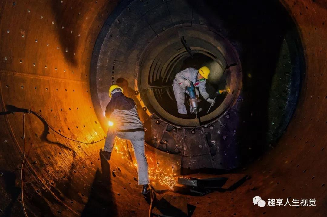 2019年2月15日常德南方水泥,電焊工黃建成在規(guī)格為3.8mx8.75m的風(fēng)掃煤磨球磨機內(nèi)切割。