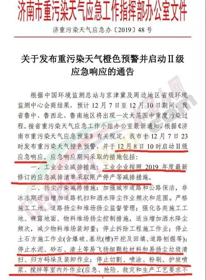 以山東濟(jì)南市重污染天氣應(yīng)急工作指揮部辦公室發(fā)布《關(guān)于發(fā)布重污染天氣橙色預(yù)警并啟動(dòng)Ⅱ級(jí)應(yīng)急響應(yīng)的通告》為例,12 月 7 日 23 時(shí)發(fā)布重污染天氣橙色預(yù)警,并于 12 月 8 日 10 時(shí)啟動(dòng)Ⅱ級(jí)應(yīng)急響應(yīng)。