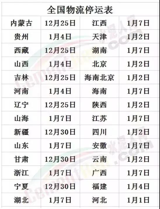 時(shí)至年底,隨著天氣寒冷和最近霧霾天氣嚴(yán)重,物流部發(fā)出聲明,全國(guó)物流停運(yùn)時(shí)間已經(jīng)確定:內(nèi)蒙古、西藏、吉林、遼寧等地12月25日停運(yùn);新疆、甘肅、寧夏等地12月30日停運(yùn);河北1月1日停運(yùn);天津、北京、陜西、四川、云南等地1月2日停運(yùn);福建、貴州、山西、河南等地1月4日停運(yùn);上海、山東、浙江、湖北、江西、湖南、海南、江蘇、安徽、廣西等地1月7日停運(yùn)。