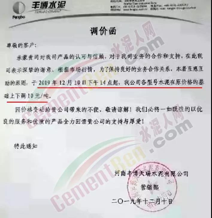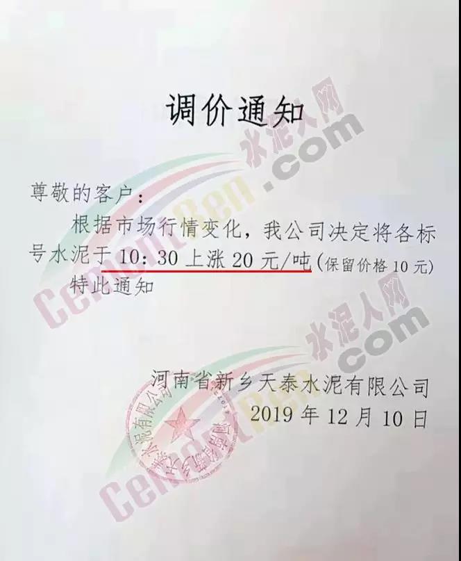 根據(jù)目前市場(chǎng)行情,經(jīng)公司研究決定,自2019年12月12日零時(shí)起我司發(fā)往各區(qū)域水泥,熟料,出廠單價(jià)在原有基礎(chǔ)上上調(diào)30元/噸。