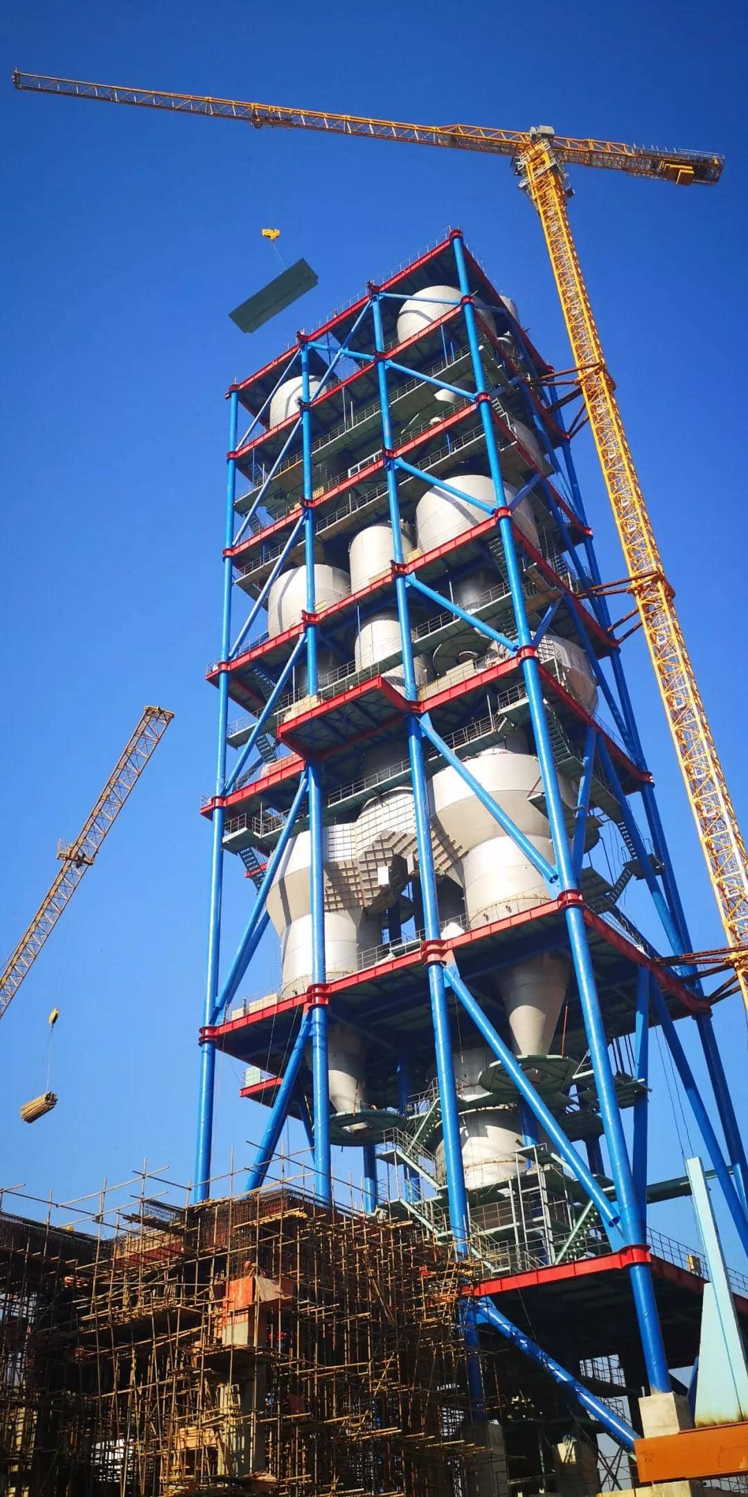 回轉(zhuǎn)窯窯尾是項(xiàng)目建設(shè)中的最高建筑,主要包括預(yù)熱器、分解爐等大型設(shè)備,在整個(gè)工藝流程中擔(dān)負(fù)生料喂入旋風(fēng)筒、循環(huán)預(yù)熱分解后入窯的重要作用。8月18日貴州尖峰項(xiàng)目的設(shè)備安裝“第一吊”,也是從窯尾開始的。