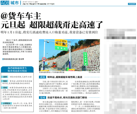 河南商報也發(fā)布了關(guān)于超限超載通知,明年1月1日起,將實行高速收費站入口稱重勸返,目前,除個別站貨車禁行外,河南境內(nèi)已通車的357個收費站、408套稱重檢測設(shè)備全部安裝到位。