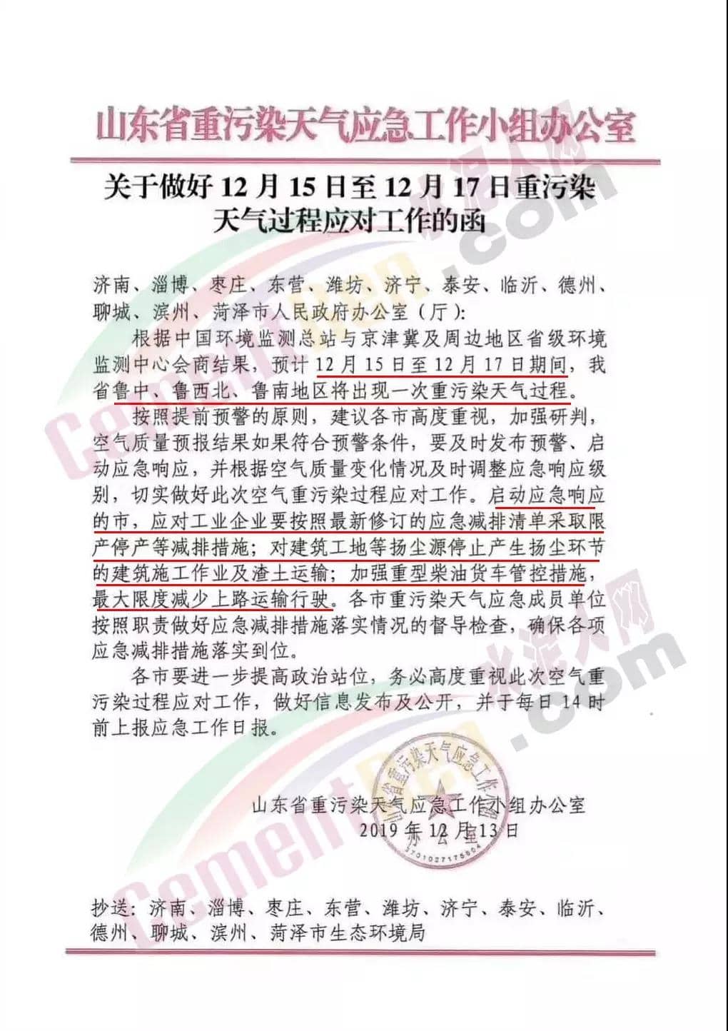 日前,山東省重污染天氣應(yīng)急工作小組辦公室發(fā)布《關(guān)于做好12月15日至12月17日重污染天氣過(guò)程應(yīng)對(duì)工作的函》稱提到12月15日至12月17日期間山東省魯中、魯西北、魯南地區(qū)將出現(xiàn)一次重污染天氣過(guò)程 。按照提前預(yù)警的原則,建議濟(jì)南、淄博、棗莊、東營(yíng)、濰坊、濟(jì)寧、泰安、臨沂、德州、聊城、濱州、荷澤市12個(gè)城市,高度重視并加強(qiáng)研判,空氣質(zhì)量預(yù)報(bào)結(jié)果如果符合預(yù)警條件,要及時(shí)發(fā)布預(yù)警、啟動(dòng)應(yīng)急響應(yīng),并根據(jù)空氣質(zhì)量變化情況及時(shí)調(diào)整應(yīng)急響應(yīng)級(jí)別,切實(shí)做好此次空氣重污染過(guò)程應(yīng)對(duì)工作。此次預(yù)警,山東省300多家水泥熟料和粉磨站企業(yè)將要面臨新一輪的停限產(chǎn)。