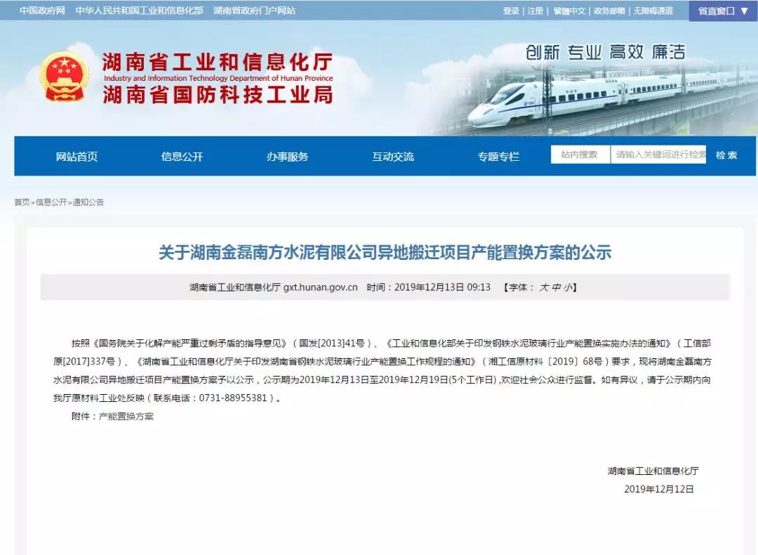 12月12日,湖南省工業(yè)和信息化廳公布了《關于湖南金磊南方水泥有限公司異地搬遷項目產能置換方案的公示》。