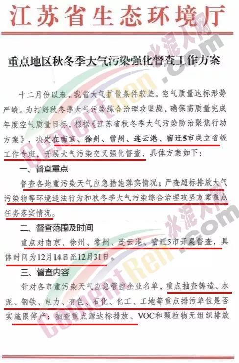 同期,江蘇省生態(tài)環(huán)境廳發(fā)布《重點(diǎn)地區(qū)秋冬季大氣污染強(qiáng)化督查工作方案》指出督查范圍為南京、徐州、常州、連云港、宿遷5市開展督查,具體時(shí)間為12月14日至12月31日。針對(duì)各市重污染天氣應(yīng)急管控企業(yè)名單,重點(diǎn)抽查鑄造、水泥、鋼鐵、電力、有色、石化、化工、工地等重點(diǎn)排污單位 是否實(shí)施停限產(chǎn);抽查重點(diǎn)源達(dá)標(biāo)排放VOC顆粒物無(wú)組織排放情況,是否存在 無(wú)治污設(shè)計(jì) ,偷排、篡改或者偽造監(jiān)測(cè)數(shù)據(jù)、不正常運(yùn)行大氣污染物防治設(shè)施等逃避監(jiān)管的方式排放大氣污染物和超標(biāo)排污等環(huán)境違法行為等。方案全文如下: