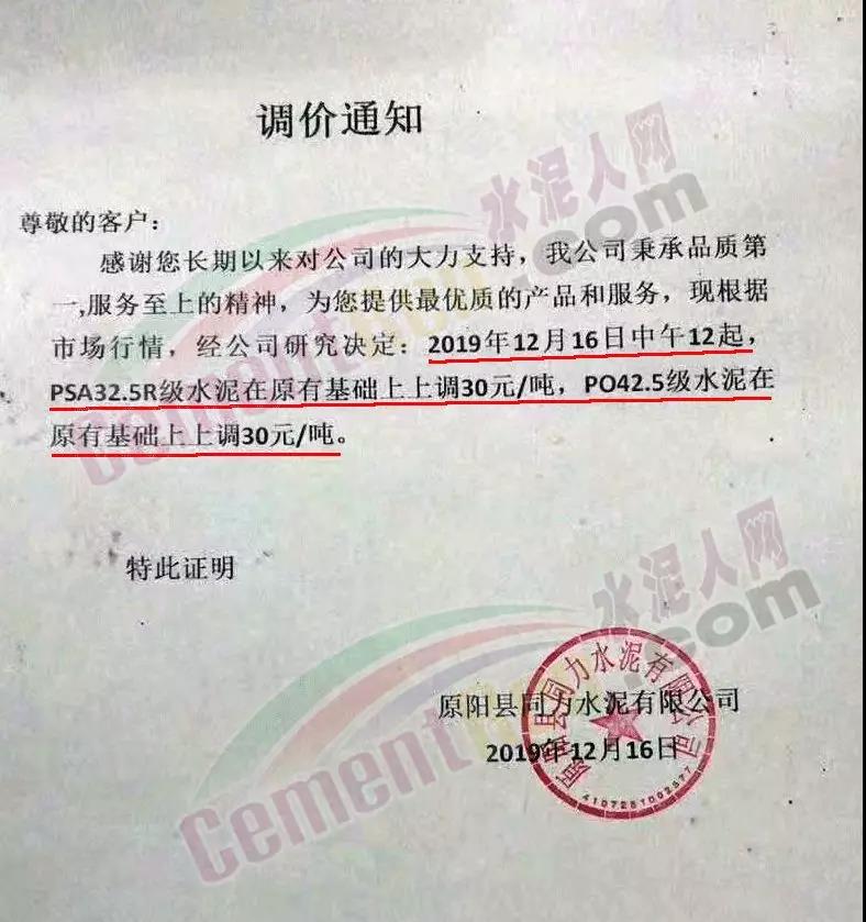 日前,河南省、廣東省及廣西壯族自治區(qū)部分區(qū)域企業(yè)通知上調(diào)水泥價格:華潤水泥通知自2019年12月17日零時起惠州地區(qū)全品種袋裝、散裝水泥價格上調(diào)20元/噸 。廣西合浦南珠水泥廠通知自2019年12月17日起,水泥價格上調(diào)30元每噸。茂名市油城牌水泥通知自12月16日0時起,P.P32.5R袋裝水泥,PO42.5袋裝水泥價格上調(diào)10元/噸。原陽縣同力水泥通知自12月16日中午12時起,PSA32.5R級、PO42.5級水泥在原執(zhí)行價格基礎(chǔ)上上調(diào)30元/噸。