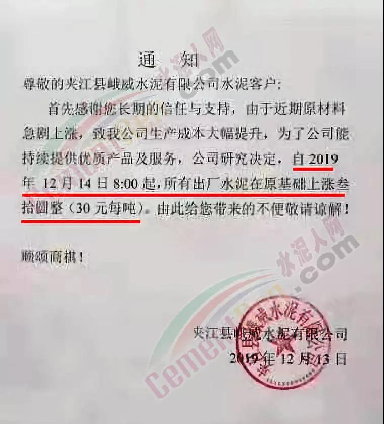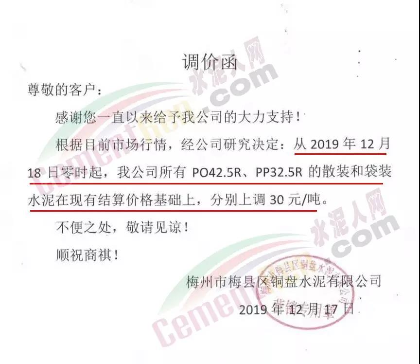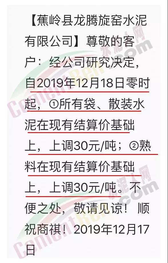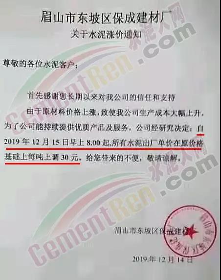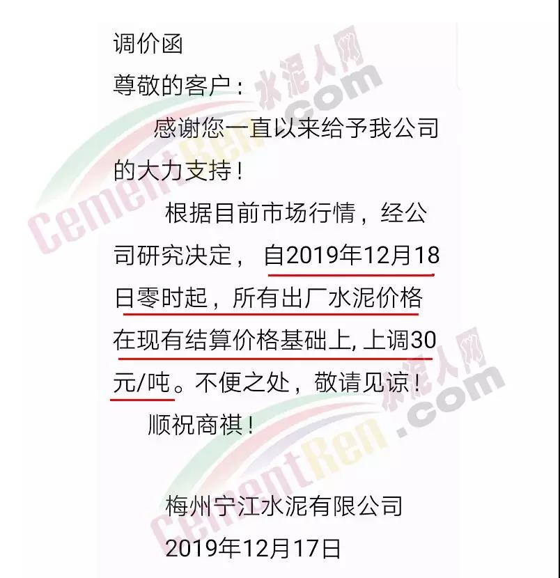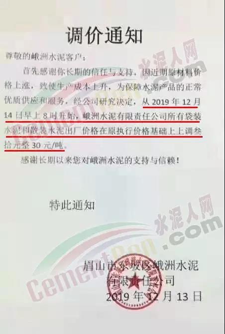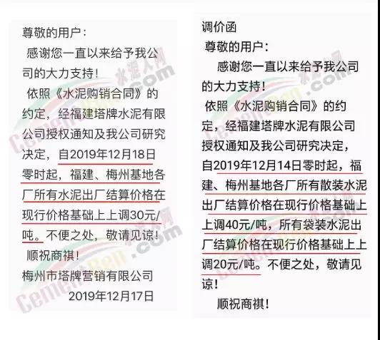 期中,梅州市塔牌營(yíng)銷通知稱依照《水泥購(gòu)銷合同》的約定,經(jīng)福建塔牌水泥有限公司授權(quán)通知及我公司研究決定,自2019年12月18日零時(shí)起,福建、梅州基地各廠所有水泥出廠結(jié)算價(jià)格在現(xiàn)行價(jià)格基礎(chǔ)上上調(diào)30元/噸。上周六(14日),這家企業(yè)剛剛通知福建、梅州各基地各廠所有散裝水泥出廠結(jié)算價(jià)格在現(xiàn)行價(jià)格基礎(chǔ)上上調(diào)40元/噸,所有袋裝水泥出廠結(jié)算價(jià)格在現(xiàn)行價(jià)格基礎(chǔ)上上調(diào)20元/噸。