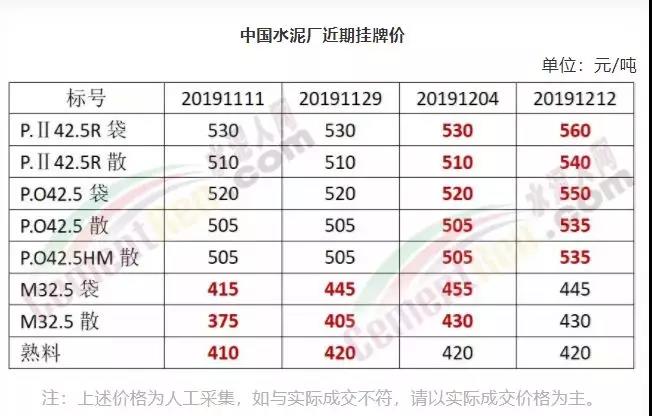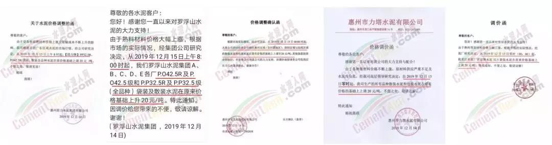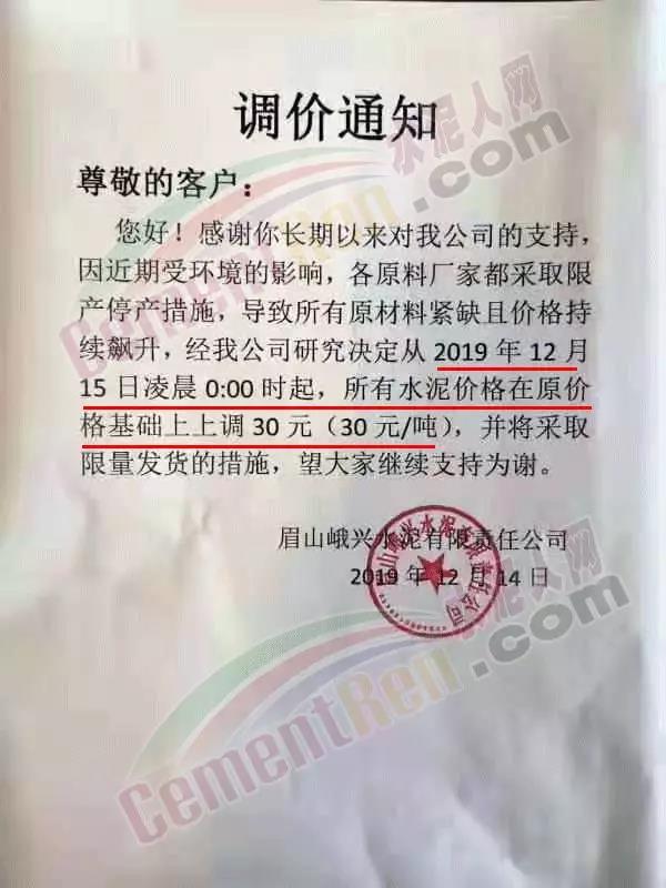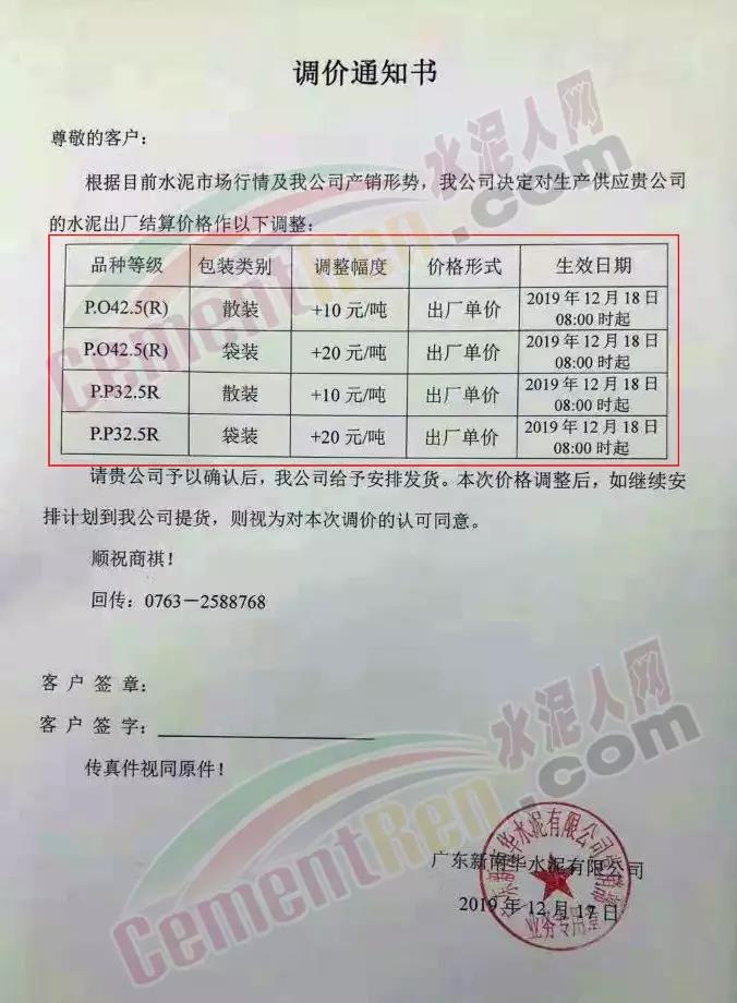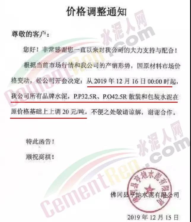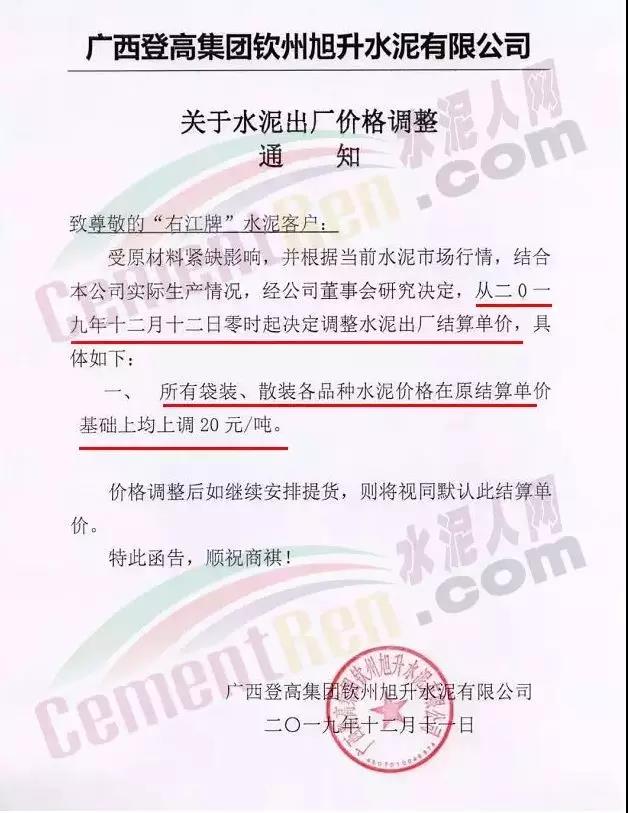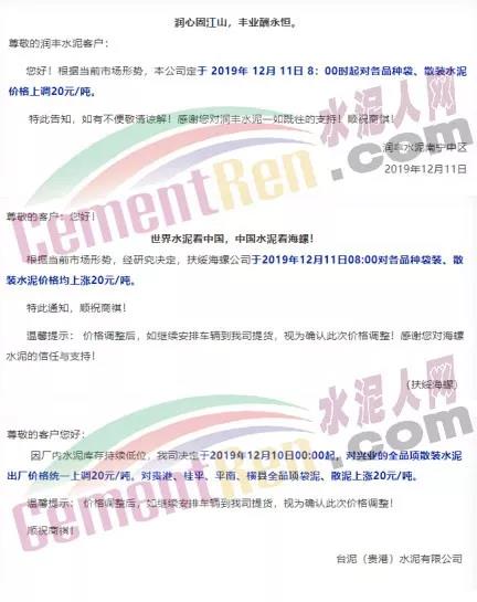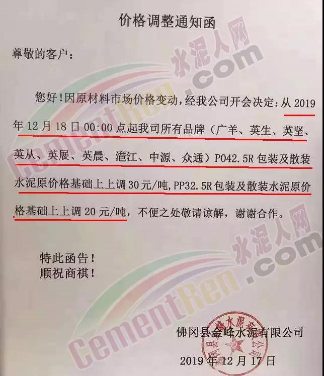 期中,梅州市塔牌營(yíng)銷通知稱依照《水泥購(gòu)銷合同》的約定,經(jīng)福建塔牌水泥有限公司授權(quán)通知及我公司研究決定,自2019年12月18日零時(shí)起,福建、梅州基地各廠所有水泥出廠結(jié)算價(jià)格在現(xiàn)行價(jià)格基礎(chǔ)上上調(diào)30元/噸。上周六(14日),這家企業(yè)剛剛通知福建、梅州各基地各廠所有散裝水泥出廠結(jié)算價(jià)格在現(xiàn)行價(jià)格基礎(chǔ)上上調(diào)40元/噸,所有袋裝水泥出廠結(jié)算價(jià)格在現(xiàn)行價(jià)格基礎(chǔ)上上調(diào)20元/噸。