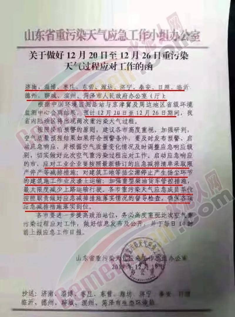 日前,山東省重污染天氣應(yīng)急工作小組辦公室發(fā)《關(guān)于做好12月20日至12月26日重污染天氣過程應(yīng)對工作的函》給濟南、淄博、棗莊、東營、濰坊、濟寧、泰安、日照、臨沂、德州、聊城、濱州、菏澤市等13市稱,根據(jù)中國環(huán)境監(jiān)測總站與京津冀及周邊地區(qū)省級環(huán)境監(jiān)測中心會商結(jié)果,預(yù)計12月20日至12月26日期間,山東省內(nèi)陸地區(qū)將出現(xiàn)兩次重污染天氣過程。按照提前預(yù)警的原則,建議各市高度重視,加強研判,空氣質(zhì)量預(yù)報結(jié)果如果符合預(yù)警條件,要及時發(fā)布預(yù)警,啟動應(yīng)急響應(yīng),并根據(jù)空氣質(zhì)量變化情況及時調(diào)整應(yīng)急響應(yīng)級別,切實做好此次空氣重污染過程應(yīng)對工作。啟動應(yīng)急響應(yīng)的市,應(yīng)對工業(yè)企業(yè)要按照最新修訂的應(yīng)急減排清單采取限產(chǎn)停產(chǎn)等減排措施;對建筑工地等揚塵源停止產(chǎn)生揚塵環(huán)節(jié)的建筑施工作業(yè)及渣土運輸;加強重型柴油貨車管控措施,最大限度減少上路運輸行駛。各市重污染天氣應(yīng)急成員單位按照職責做好應(yīng)急減排措施落實情況的督導檢查,確保各項應(yīng)急減排措施落實到位。各市要進一步提高政治站位,務(wù)必高度重視此次空氣重污染過程應(yīng)對工作,做好信息發(fā)布及公開。文件原文如下: