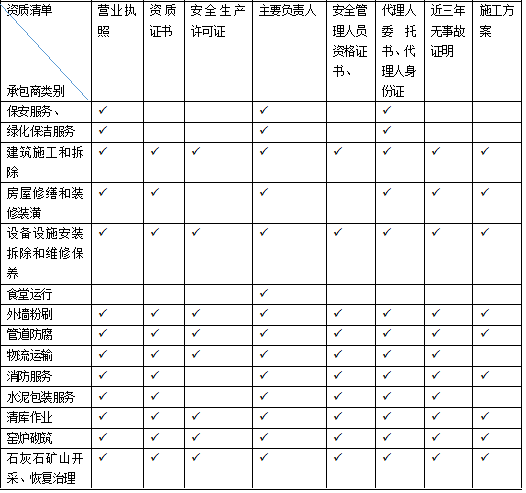 為便于各企業(yè)在審核時(shí)掌握情況,給出一份各類承包商資質(zhì)清單供參考: