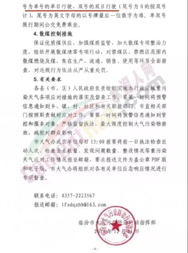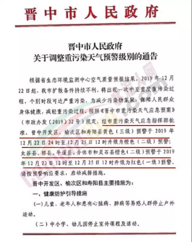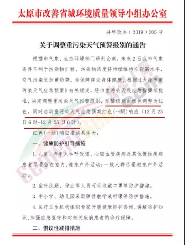 同日,太原市公安局關于發(fā)布重污染天氣臨時交通管理措施的通告稱根據(jù)太原市改善省城環(huán)境質量領導小組《關于調整重污染天氣預警級別的通告》(并環(huán)改辦[2019]205號)和《太原市重污染天氣應急預案》規(guī)定,接市重污染天氣應急指揮部通知,決定調整重污染天氣預警級別,預警級別由橙色調整為紅色,同時啟動重污染天氣應急預案紅色(一級)響應(12月23日0時—12月25日0時)。為應對空氣重污染、保護公眾健康,市政府決定,對在本市行政區(qū)域內道路行駛的機動車(含臨時號牌車輛)采取臨時交通管理措施。