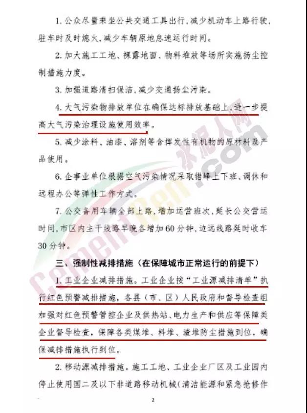 1.根據(jù)生態(tài)環(huán)境部《關于加強重污染天氣應對夯實應急減排措施的指導意見》,結合最新修訂的應急減排清單,對工業(yè)企業(yè)采 取相應減排措施;對納入重污染天氣應急減排清單的企業(yè)加強監(jiān) 管,確保各類污染防治設施高效運轉,各項污染物穩(wěn)定達標排放。