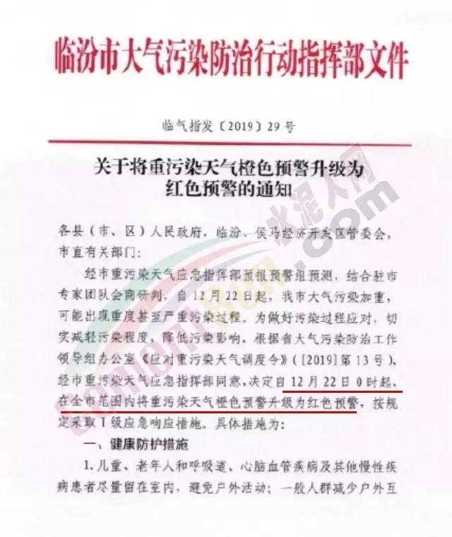 同一日,山西省生態(tài)環(huán)境廳通知,12月22日,山西省太原、臨汾、運城大氣污染加重,可能出現(xiàn)重度甚至嚴重污染過程。為做好污染過程應對,切實減輕污染程度,降低污染影響,3市分別調整重污染天氣預警級別,預警級別由橙色調整為紅色,同時啟動重污染天氣應急預案紅色(一級)響應。