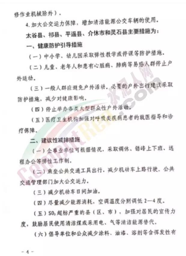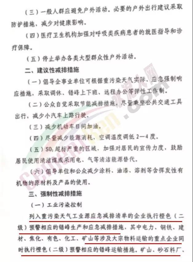 (一)工業(yè)源停限產措施。1、鋼鐵行業(yè)。承擔供暖任務的企業(yè):在橙色預警減排措施基礎上,燒結機、球團裝備、石灰窯增加20%限產比例。不承擔供暖任務的企業(yè):績效評價等級為B級的,燒結機、球團設備、石灰窯停產。績效評價為C級的,燒結機、球團設備、石灰窯停產;高爐停產50%(含)以上。如預警響應時間超過120小時,之后時段燒結機、球團裝備停產50%以上(以生產線計算停產比例)。鋼鐵企業(yè)停限產計劃要明確到具體裝備,各縣(市、區(qū))政府將鋼鐵企業(yè)停限產計劃統(tǒng)一匯總后于12月23日10時前報市應急管理局和市環(huán)保指揮中心備案。2、其他行業(yè)。嚴格按照《重污染天氣應急工業(yè)源污染物減排清單》中“橙色預警減排措施”執(zhí)行。(二)移動源限行措施。1、施工工地、工業(yè)企業(yè)廠區(qū)和工業(yè)園區(qū)內停止使用國二及以下非道路移動機械。2、市中心城區(qū)環(huán)城路以內以及各縣(市)區(qū)城區(qū),每天7時至20時禁止大型貨車(含持有通行證)、三輪汽車、低速載貨汽車通行,禁止建筑垃圾和渣土運輸車、砂石運輸車輛上路行駛。3、礦山、洗煤廠、港口、物流(除民生保障類)等涉及大宗原料和產品運輸(日常車輛進出量超過10輛)的單位禁止使用國四及以下重型載貨汽車(含燃氣)進行運輸。4、工業(yè)企業(yè)移動源限行措施執(zhí)行《關于印送〈關于加強重污染天氣應對夯實應急減排措施的指導意見〉的函》(環(huán)辦大氣函〔2019〕648號)相關條款。5、12月23日至26日,每天7時至20時,全市黨政機關、事業(yè)單位、國有企業(yè)公務用車采取單雙號限行措施(含本地臨時牌照,不含外地車牌),單號單日通行,雙號雙日通行,尾號是字母的以最后一個數(shù)字為準。(三)揚塵源控制措施。1、礦山、沙石料廠、石材廠、石板廠等停止露天作業(yè);施工工地停止土石方作業(yè)、建筑拆除、噴涂粉刷、護坡噴漿、混凝土攪拌等;未安裝密閉裝置易產生遺撒的煤炭、渣土、砂石料等運輸車輛停止上路。2、在常規(guī)作業(yè)基礎上,對城市主要干道增加機掃、吸掃等清潔頻次,但應避開早、中、晚城市交通高峰期;主干道和易產生揚塵路段應增加機掃頻次。3、城市主城區(qū)、縣(市、區(qū))城區(qū)禁止燃放煙花爆竹和露天燒烤。