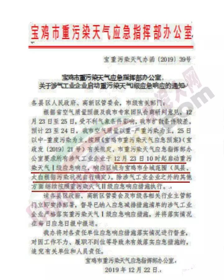 12月22日,陜西省寶雞市重污染天氣應急指揮部辦公室要求所有涉氣工業(yè)企業(yè)于12月23日10時起啟動重污染天氣Ⅰ級應急響應,響應區(qū)域為寶雞市全域范圍(鳳縣、太白根據(jù)污染狀況自行確定)。除涉氣工業(yè)企業(yè)之外的其他方面繼續(xù)按照重污染天氣Ⅱ級應急響應措施執(zhí)行。