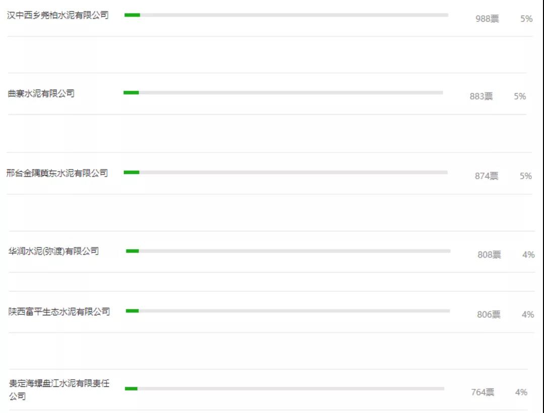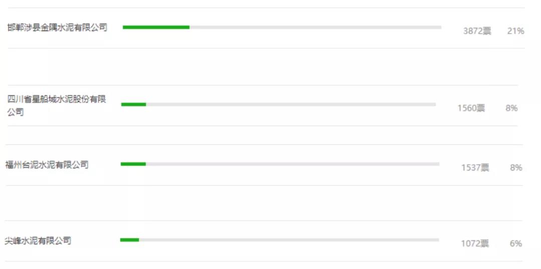 一、邯鄲涉縣金隅水泥3872票。二、四川星船城水泥股份有限公司1560票。三、福州臺(tái)泥水泥有限公司位居前三位1537票。四、尖峰水泥1072票。五、漢中西鄉(xiāng)堯柏水泥有限公司988票。六、曲寨水泥有限公司883票。七、邢臺(tái)金隅冀東水泥有限公司874票。八、華潤水泥(彌渡)有限公司808票。九、陜西富平生態(tài)水泥有限公司806票。十、貴定海螺盤江水泥有限責(zé)任公司764票。