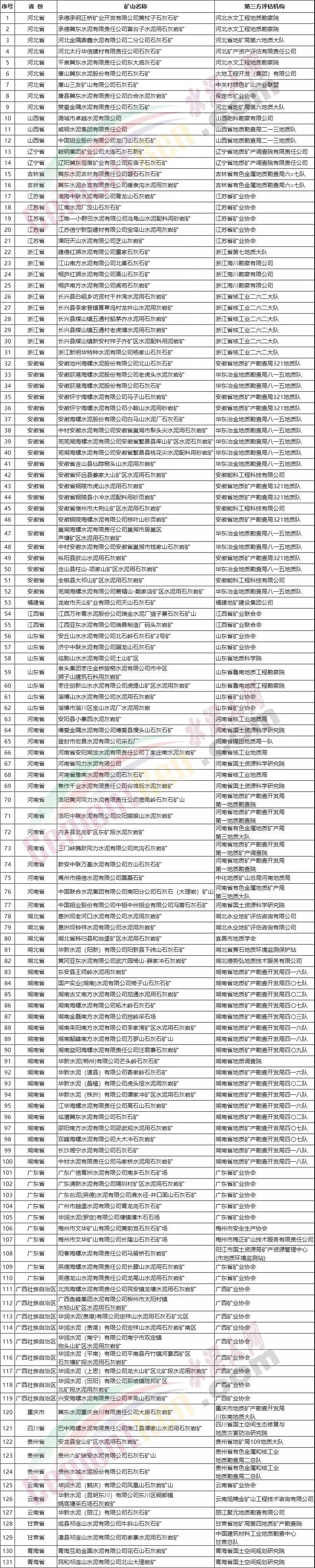公示名單中包括海螺水泥、中聯(lián)水泥、南方水泥、中材水泥、天山水泥、祁連山水泥、華新水泥、華潤水泥、金隅冀東、山水水泥、紅獅水泥、金圓水泥等水泥集團企業(yè)所屬礦山,其中石灰石礦山共132家,涉及區(qū)域包括河北省、山西省、吉林省、江蘇省、安徽省、福建省、江西省、山東省、湖南省、廣西壯族自治區(qū)、重慶市、四川省、貴州省、云南省、甘肅省、青海省等16個省自治區(qū)。