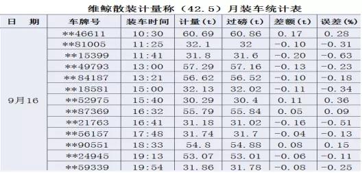 維鯨散裝計量秤目前已在水泥生產(chǎn)企業(yè)中有多個應(yīng)用案例,取得良好的應(yīng)用效果,以2019在安徽某水泥生產(chǎn)企業(yè)的實測數(shù)據(jù)記錄為例,可以看出使用該系統(tǒng)后的計量精度均保持在1%以內(nèi),在一個月內(nèi)無返車打料或加裝的現(xiàn)象,完全可達到一次裝車完成無超載出廠的情況。