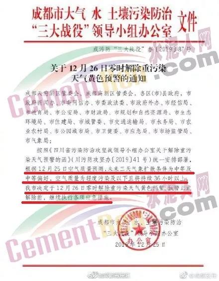 12月25日,四川省成都市大氣水土壤污染防治三大戰(zhàn)役領(lǐng)導(dǎo)小組辦公室發(fā)布了《關(guān)于12月26日零時(shí)解除重污染天氣黃色預(yù)警的通知》稱,成都市定于12月26日零時(shí)解除重污染天氣黃色預(yù)警,預(yù)警正式解除前,繼續(xù)執(zhí)行各項(xiàng)應(yīng)急措施。通知原文如下0: