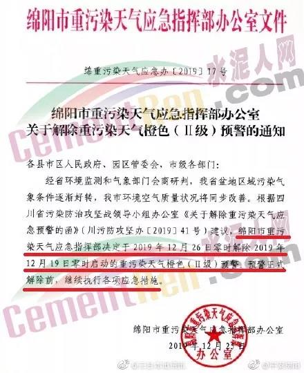 同期,四川省綿陽市重污染天氣應(yīng)急指揮部辦公室發(fā)布了《關(guān)于解除重污染天氣橙色(II級(jí))預(yù)警的通知》稱,綿陽市重污染天氣應(yīng)急指揮部定于2019年12月26日零時(shí)解除2019年12月19日零時(shí)啟動(dòng)的重污染天氣橙色(II級(jí))預(yù)警,預(yù)警正是解除前,繼續(xù)執(zhí)行各項(xiàng)應(yīng)急措施。通知原文如下: