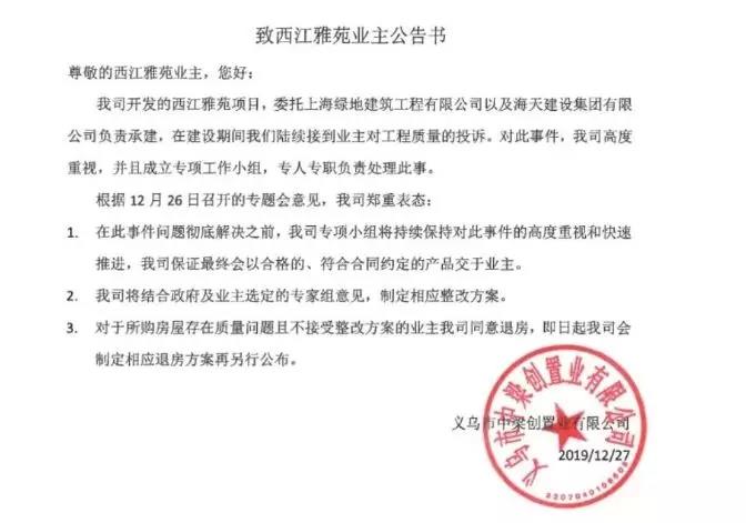 28日,微信認(rèn)證賬號主體為義烏市中梁創(chuàng)置業(yè)有限公司的公眾號“金地中梁西江雅苑”發(fā)布致西江雅苑業(yè)主公告書。