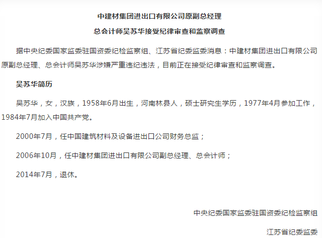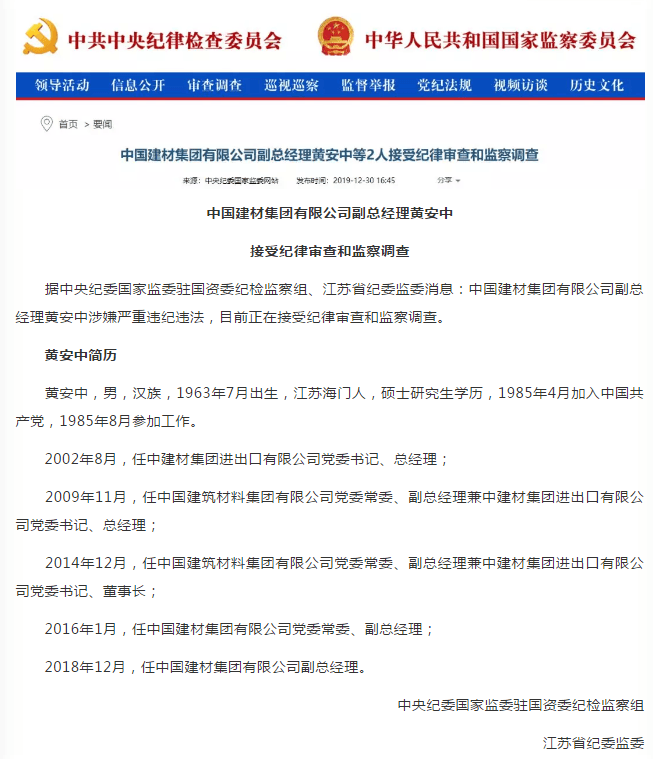 據(jù)中央紀(jì)委國(guó)家監(jiān)委駐國(guó)資委紀(jì)檢監(jiān)察組、江蘇省紀(jì)委監(jiān)委消息:中國(guó)建材集團(tuán)有限公司副總經(jīng)理黃安中等2人接受紀(jì)律審查和監(jiān)察調(diào)查。
