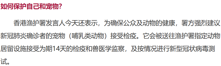 漁護署發(fā)言人表示,為確保公眾及動物的健康,署方強烈建議新冠肺炎確診者的寵物(哺乳類動物)接受檢疫。它會被送往漁護署指定動物居留設(shè)施接受為期14天的檢疫和獸醫(yī)學(xué)監(jiān)察,及按情況進行新型冠狀病毒測試。