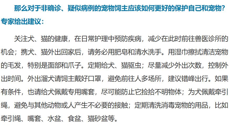 另據(jù)香港特區(qū)政府4日晚間發(fā)布的新聞公報消息,香港漁護署發(fā)言人還強調(diào),現(xiàn)時沒有證據(jù)顯示寵物會傳播新冠病毒,或會因此生病。除保持良好衛(wèi)生習(xí)慣外,寵物畜養(yǎng)人毋須過份憂慮。在任何情況下,絕不應(yīng)棄養(yǎng)寵物。