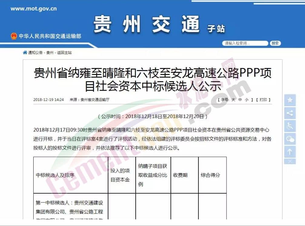 2018年12月19日,總投資達(dá)596億元的貴州省納雍至晴隆和六枝至安龍高速公路PPP項(xiàng)目社會資本項(xiàng)目納晴子項(xiàng)目和六安子項(xiàng)目在貴州交通廳網(wǎng)站發(fā)布了中標(biāo)結(jié)果。