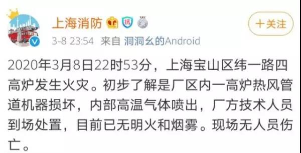 據(jù)上海消防通報,2020年3月8日22時53分,上海寶山區(qū)緯一路四高爐發(fā)生火災。初步了解是廠區(qū)內一高爐熱風管道機器損壞,內部高溫氣體噴出,廠方技術人員到場處置,目前已無明火和煙霧?,F(xiàn)場無人員傷亡。