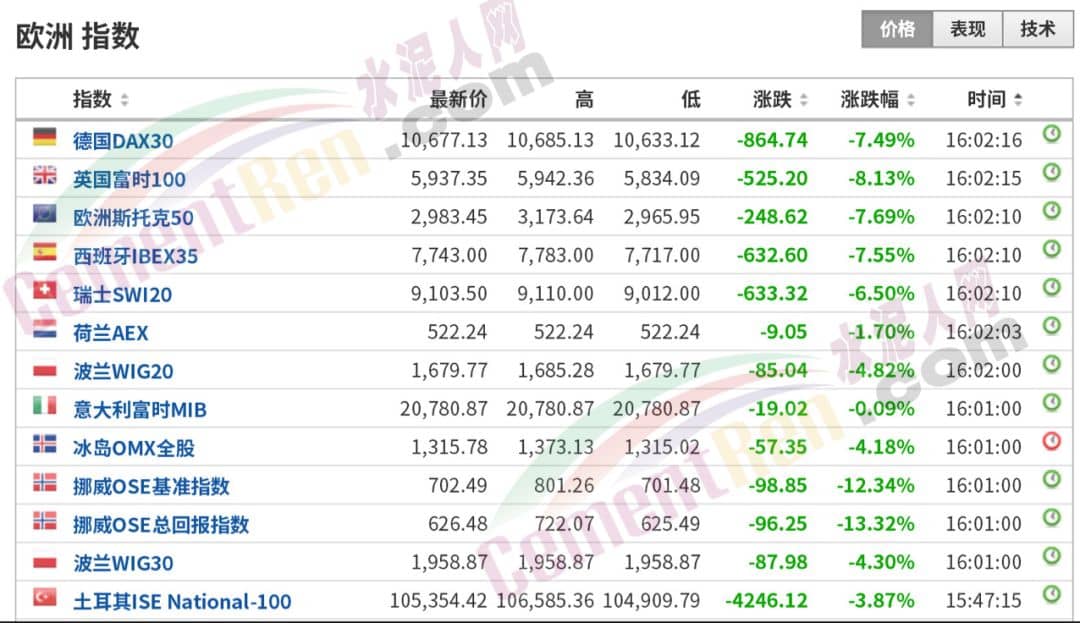 歐美股市也遭遇壓力,歐洲股市開盤全線暴跌,德國DAX指數(shù)跌超7%;英國富時100跌超8%;盤前美股標(biāo)普500、道瓊斯30股指期貨跌幅超4%。