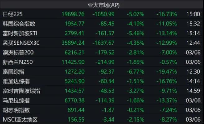 亞太股市方面,日經(jīng)225指數(shù)大跌超5%以上,刷新2019年1月初以來低位。越南股市擴(kuò)大跌幅至6.2%,創(chuàng)2001年10月以來最大跌幅。