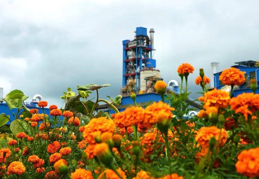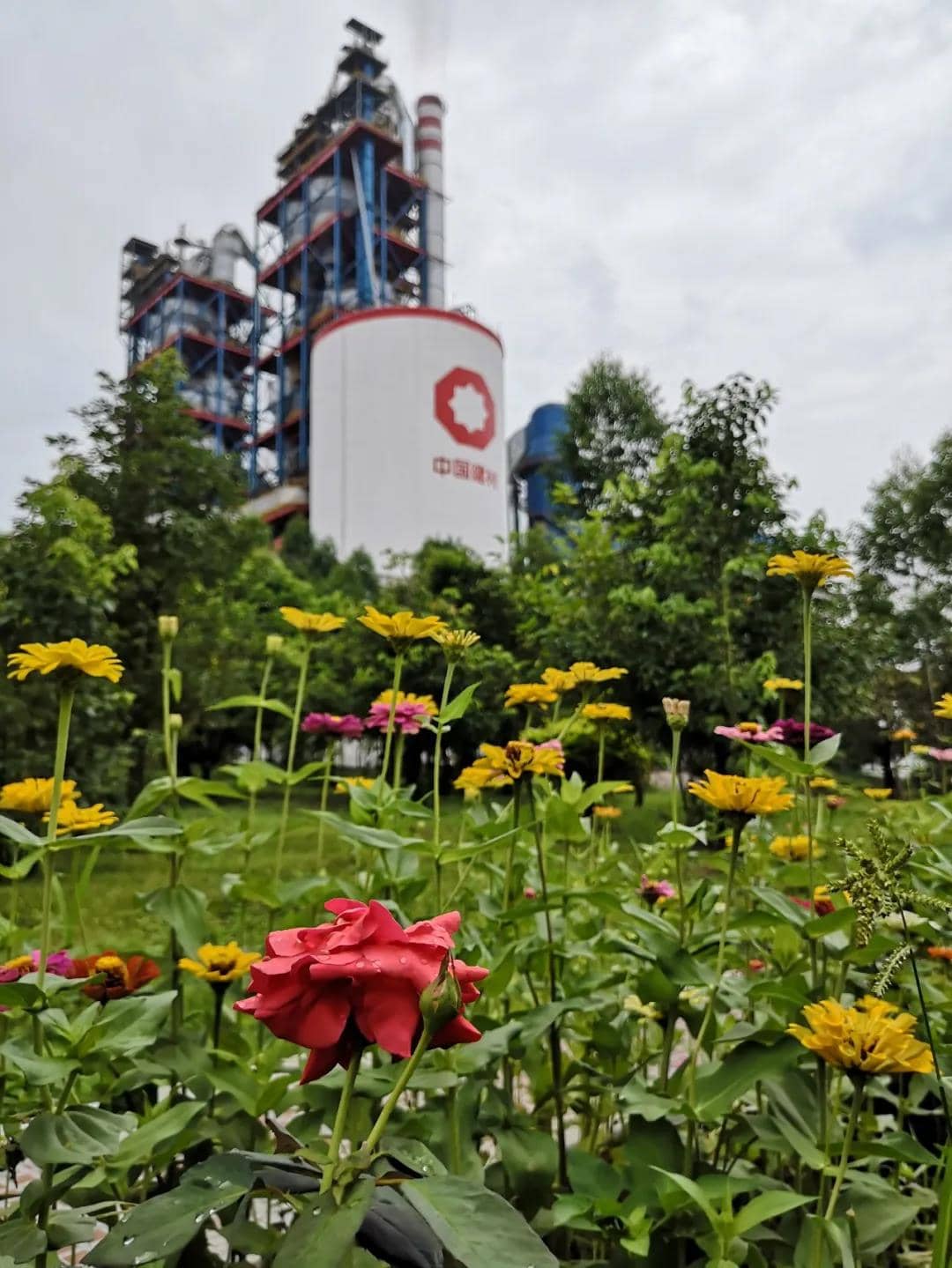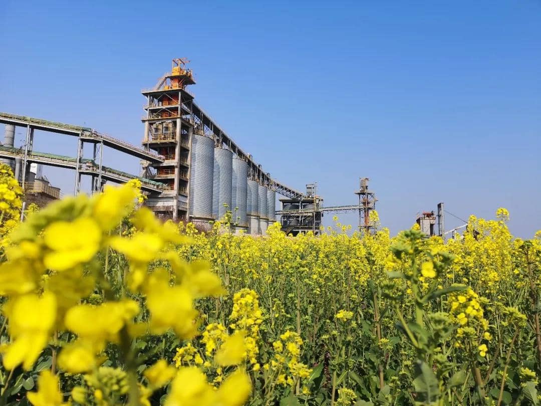 ▲被油菜花田環(huán)繞的中材株洲水泥