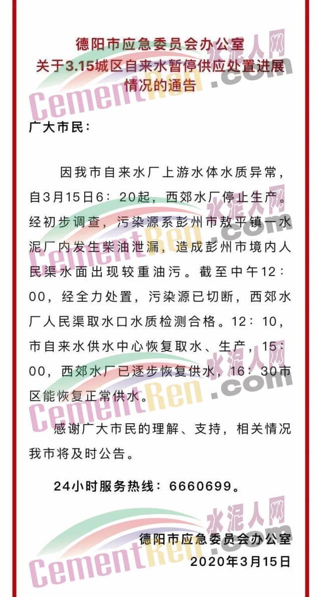 經(jīng)過努力,3月15日12點(diǎn)10分,經(jīng)連續(xù)監(jiān)測(cè),取水口水質(zhì)達(dá)標(biāo),水廠恢復(fù)取水,15點(diǎn)城區(qū)逐步恢復(fù)供水,截止16點(diǎn)30分,市區(qū)恢復(fù)正常供水。