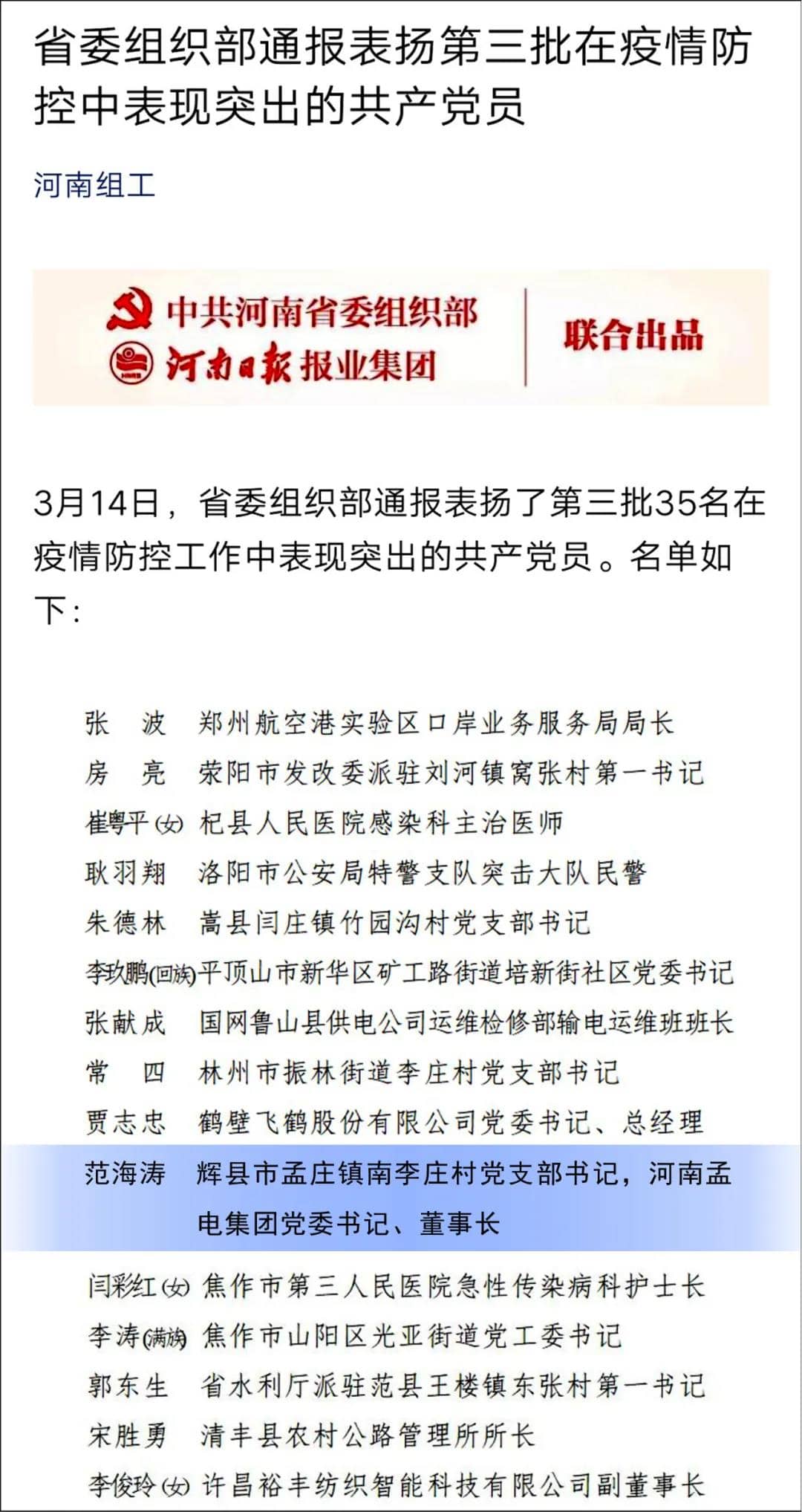 3月14日,河南省委組織部通報(bào)表揚(yáng)了第三批在疫情防控工作中表現(xiàn)突出的共產(chǎn)黨員,輝縣市孟莊鎮(zhèn)南李莊村黨支部書記,河南孟電集團(tuán)黨委書記、董事長范海濤名列其中。