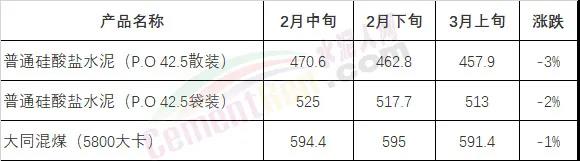 國家統(tǒng)計局流通領域重要生產(chǎn)資料市場價格變動情況顯示自2月中旬開工以來,水泥及煤炭等價格下行。市場主流產(chǎn)品PO.42.5水泥均價跌幅在2%~3%。