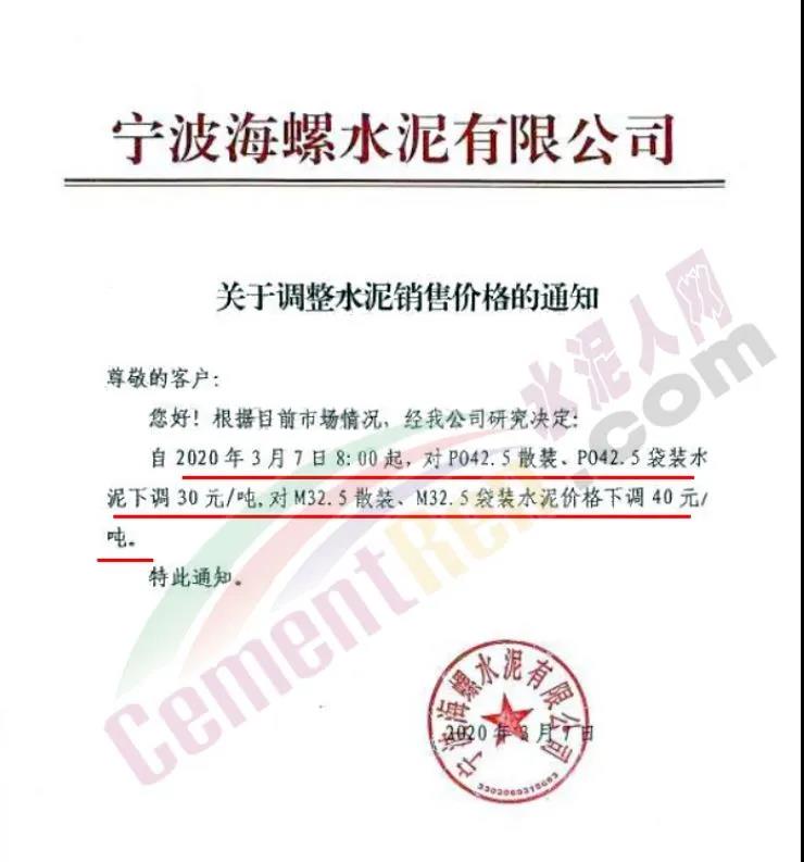 3月7日,浙江寧波主導企業(yè)通知,PO42.5散裝、PO42.5袋裝水泥下調(diào)30元/噸,M32.5散裝、M32.5袋裝水泥價格下調(diào)40元/噸。