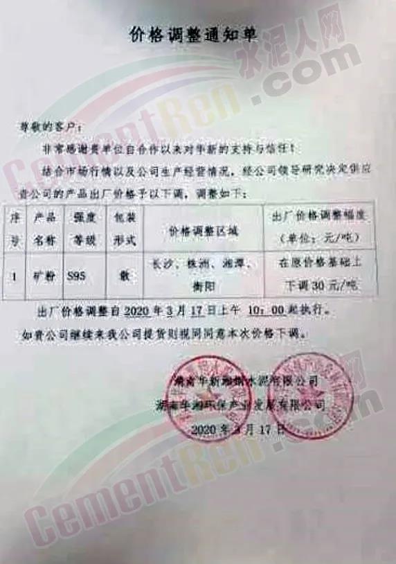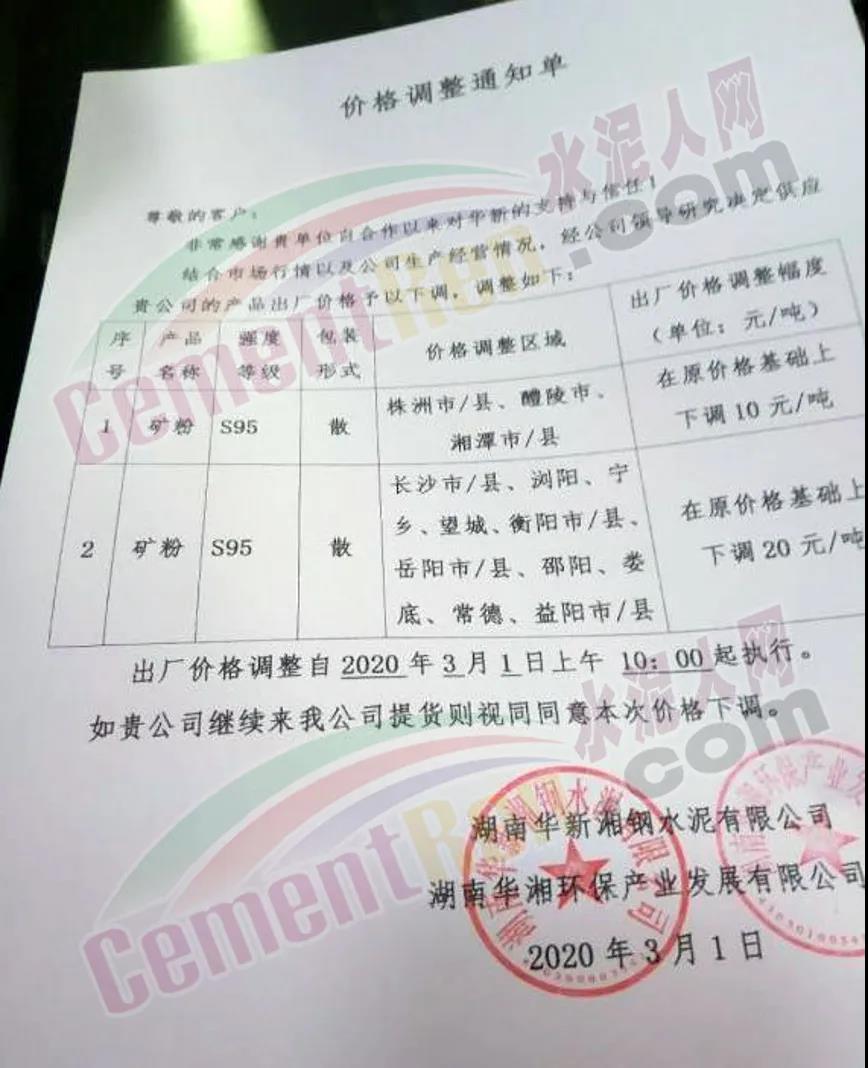2月24日再次通知下調(diào)42.5及以上等級袋裝水泥價格20元/噸,各品種散泥價格同步下調(diào)30元/噸。