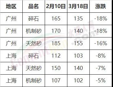 砂石方面,華南區(qū)域廣州區(qū)域礦石、機制砂、天然砂跌幅達16~18%。上海市砂石價報價較2月中旬跌幅在5%以上。