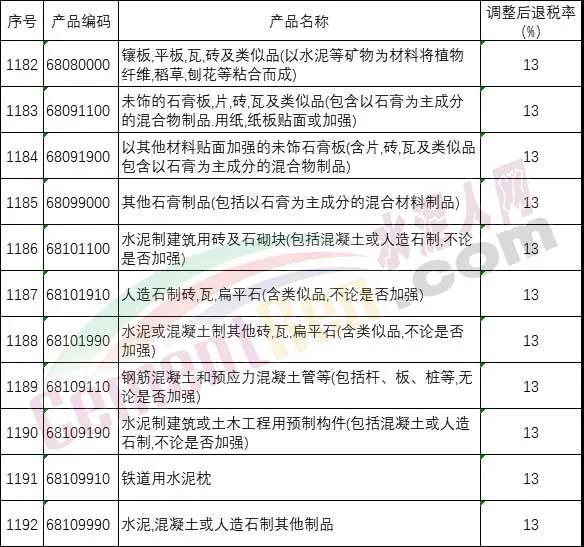 日前,國(guó)家財(cái)政部發(fā)布關(guān)于提高部分產(chǎn)品出口退稅率的公告,提高出口退稅率的產(chǎn)品清單中水泥,混凝土或人造石制其他制品等十余類產(chǎn)品調(diào)整后退稅率為13%,相關(guān)類如下: