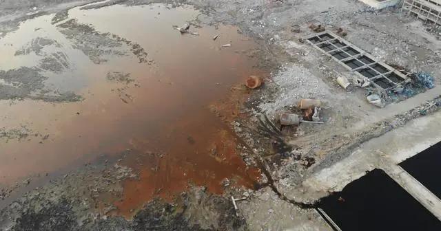 今年3月中旬,記者航拍的畫面顯示,核心區(qū)內(nèi)仍有一個(gè)直徑超百米的大坑,內(nèi)有大片紅棕色液體,一旁停放著三臺挖土機(jī)。天嘉宜公司的廠房如今已基本拆除完畢,現(xiàn)已變成一片空地,僅遺留少數(shù)建筑殘骸和建筑垃圾。園區(qū)內(nèi)部分區(qū)域有殘留的黑色污染物,個(gè)別低洼地區(qū)能看到黑色的積水。