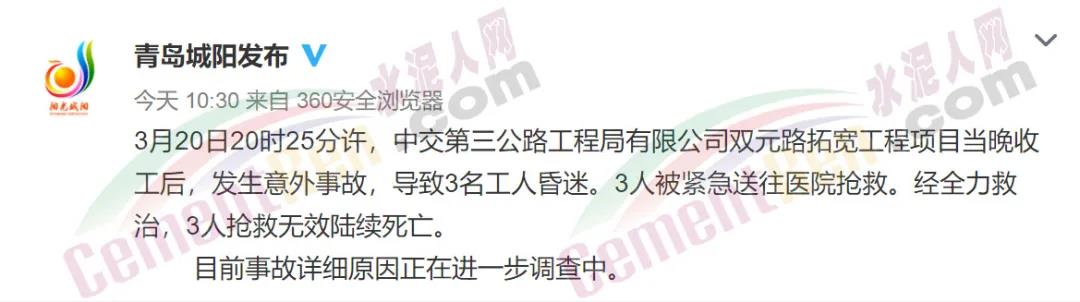 據(jù)青島市城陽區(qū)人民政府新聞辦公室消息,3月20日20時(shí)25分許,中交第三公路工程局有限公司雙元路拓寬工程項(xiàng)目當(dāng)晚收工后,發(fā)生意外事故,導(dǎo)致3名工人昏迷。3人被緊急送往醫(yī)院搶救。經(jīng)全力救治,3人搶救無效陸續(xù)死亡。