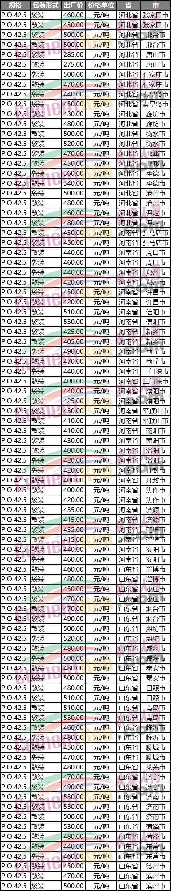 河北、河南、山東P.O42.5水泥價(jià)格如下: