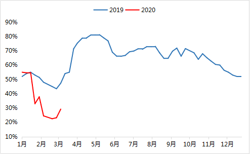截至3月4日,百年建筑網(wǎng)調(diào)研全國(guó)500家混凝土攪拌站復(fù)工率72%,復(fù)產(chǎn)率為48%,調(diào)研當(dāng)周發(fā)貨量為48.6萬方,雖然環(huán)比上周大幅增長(zhǎng)66.4%,但也僅是正常水平的一成,由于水泥是混凝土生產(chǎn)中必不可少的原材料,而混凝土是即產(chǎn)即銷的產(chǎn)品,因此其發(fā)貨量將直接反應(yīng)到水泥需求上,目前攪拌站整體發(fā)貨量偏低,由此可以看出攪拌站對(duì)水泥大量采購(gòu)還有待時(shí)日。