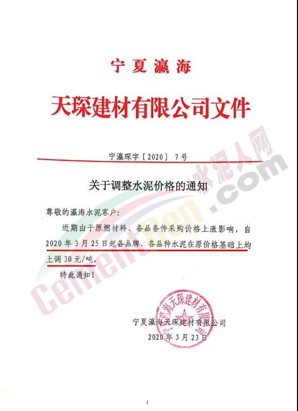 昨日(3月23日)寧夏瀛海天琛建材有限公司發(fā)布《關(guān)于調(diào)整水泥價(jià)格的通知》稱,近期由于原材料、備品備件采購價(jià)格上漲的影響,自2020年3月25日起,各品牌、各品種水泥在原價(jià)格基礎(chǔ)上均上調(diào)30元/噸。