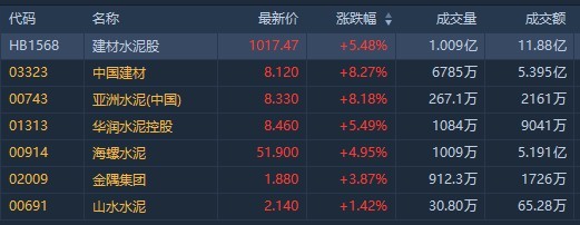 截至發(fā)稿,中國建材(03323)漲8.27%,報(bào)8.12港元;亞洲水泥(中國)(00743)漲8.05%,報(bào)8.32港元;華潤水泥控股(01313)漲5.36%,報(bào)8.46港元;海螺水泥(600585,股吧)(00914)漲4.95%,報(bào)51.9港元。