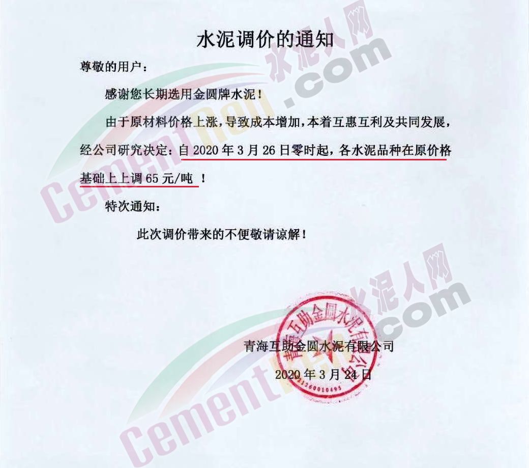 日前,青?;ブ饒A水泥有限公司通知將自3月26日零時(shí)起上調(diào)水泥價(jià)格,各品種在原價(jià)格基礎(chǔ)上上調(diào)65元/噸。