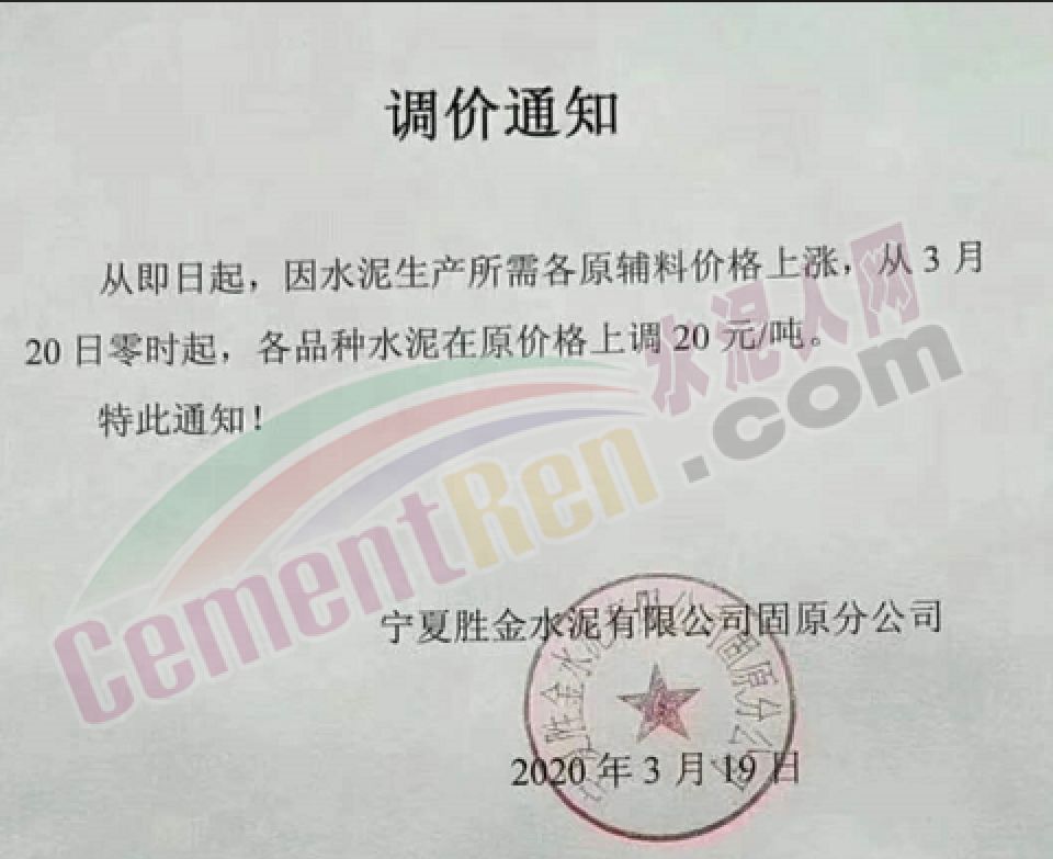 3月24日,寧夏勝金水泥有限公司發(fā)布《關(guān)于調(diào)整水泥價(jià)格通知》稱,結(jié)合目前的水泥市場(chǎng)行情,經(jīng)公司研究決定,自2020年3月25日凌晨起,寧夏勝金各型號(hào)水泥在原價(jià)格的基礎(chǔ)上每噸上調(diào)20元。