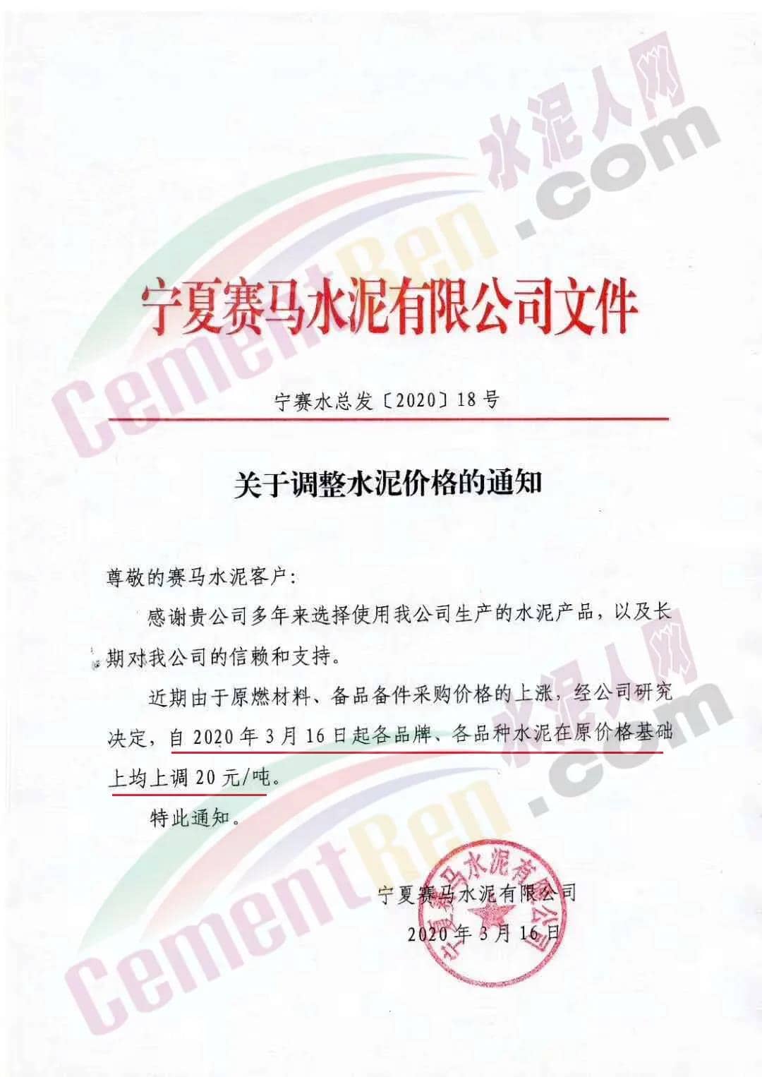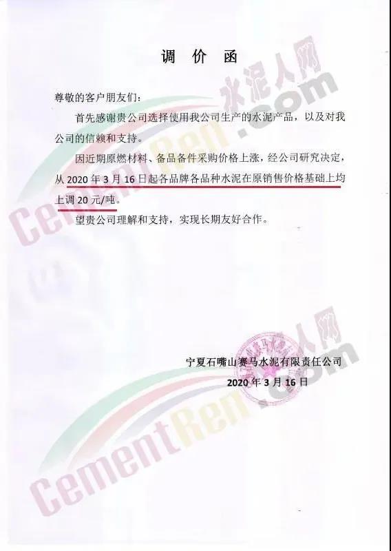 寧夏石嘴山賽馬水泥有限公司同一天通知上調(diào)各品種水泥價(jià)格20元/噸。